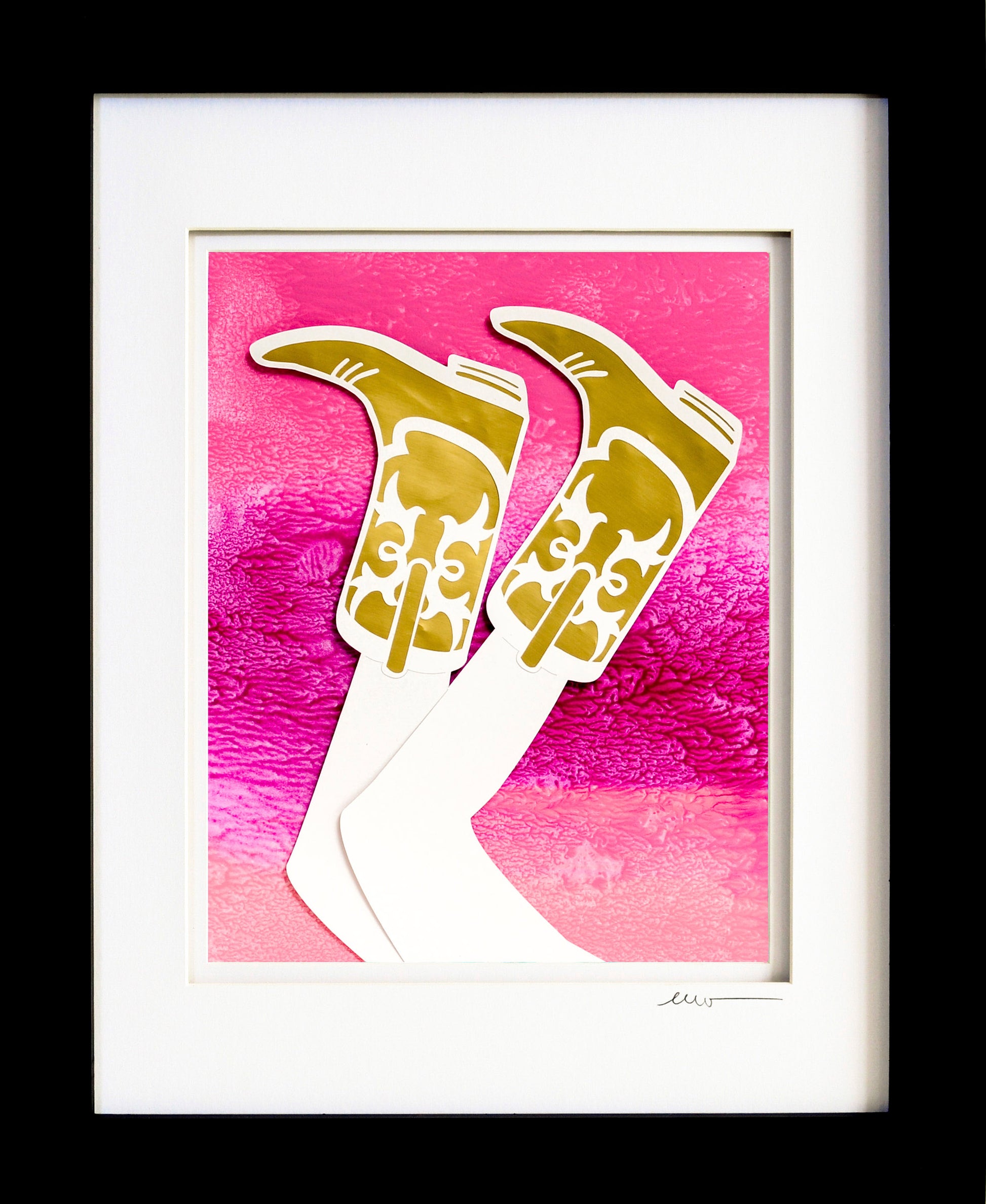 Each crisp white papercut features a unique “color me happy” background crafted from recycled paper or the artist’s hand-marbled paper and acrylic paintings.