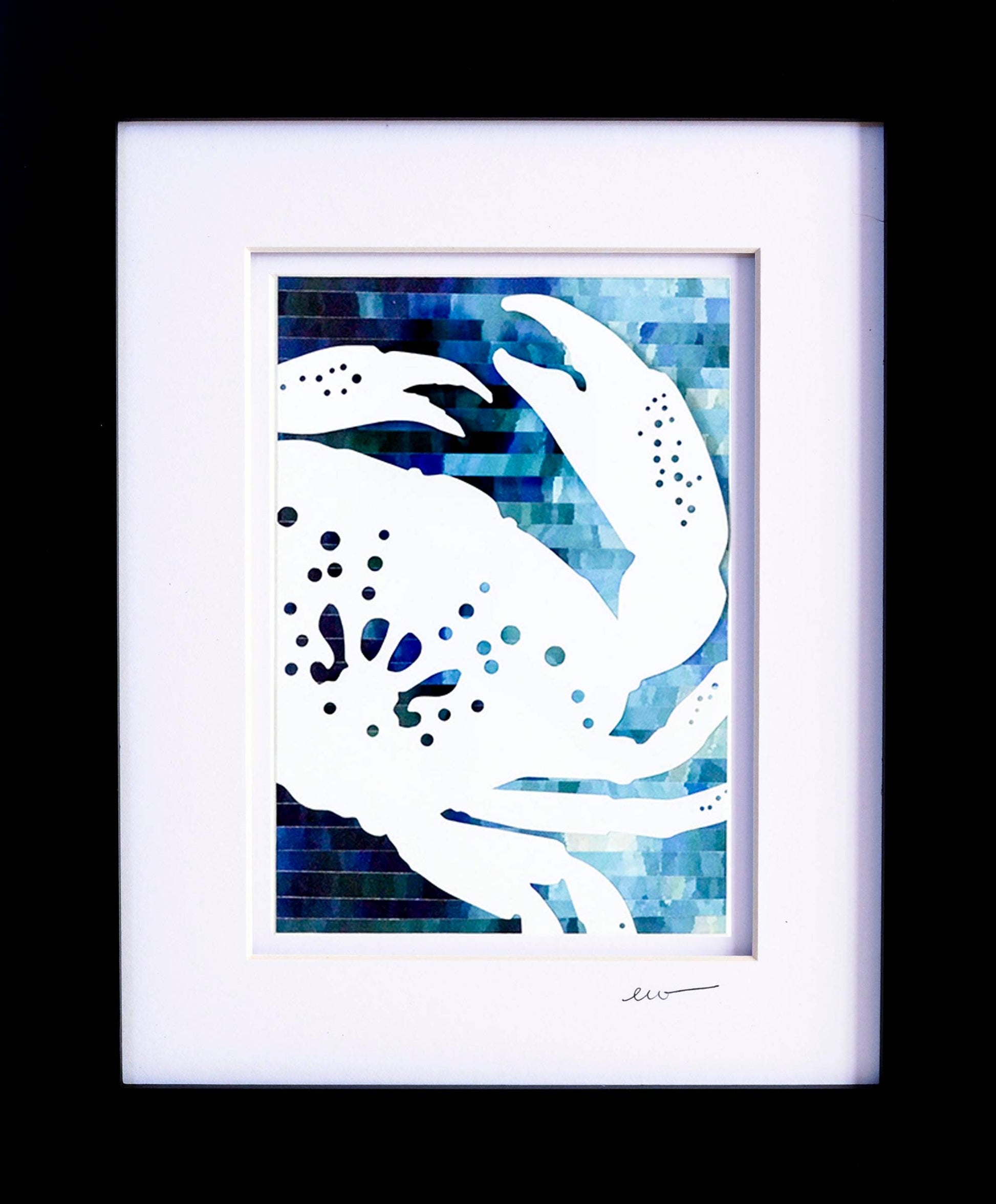 Each crisp, white papercut is set off by a “color me happy” one-of-a-kind background made from recycled paper or the artist’s own hand-marbled paper and acrylic paintings. Then signed, matted, and framed.