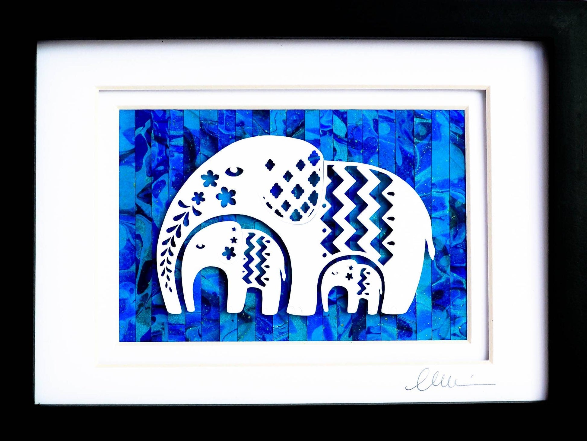 Each crisp, white papercut is set off by a “color me happy” one of a kind background made from recycled paper or the artist’s own hand-marbled paper and acrylic paintings. Then signed, matted, and framed.