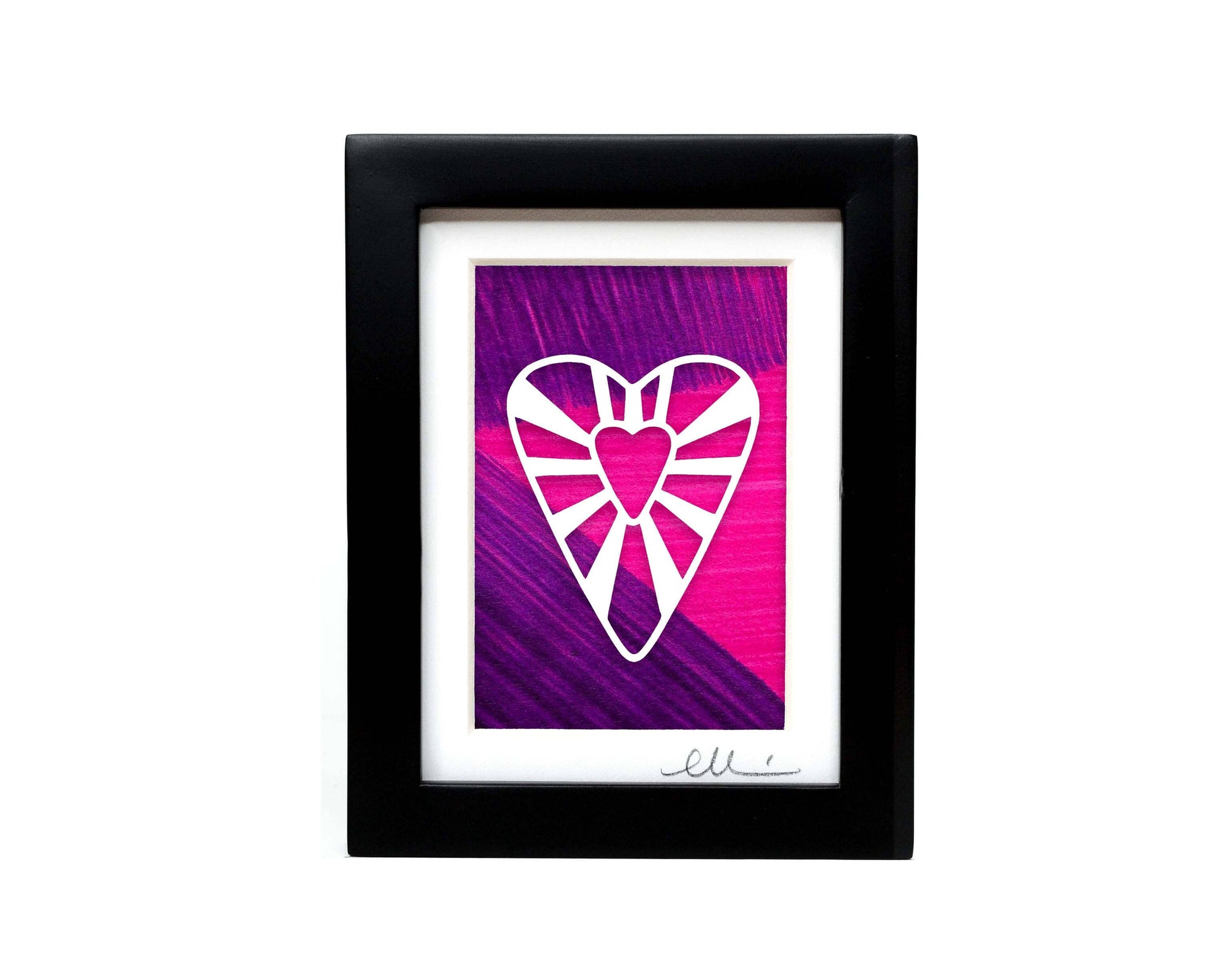 Each crisp, white papercut is set off by a “color me happy” one-of-a-kind background made from recycled paper or the artist’s own hand-marbled paper and acrylic paintings. Then signed, matted, and framed.