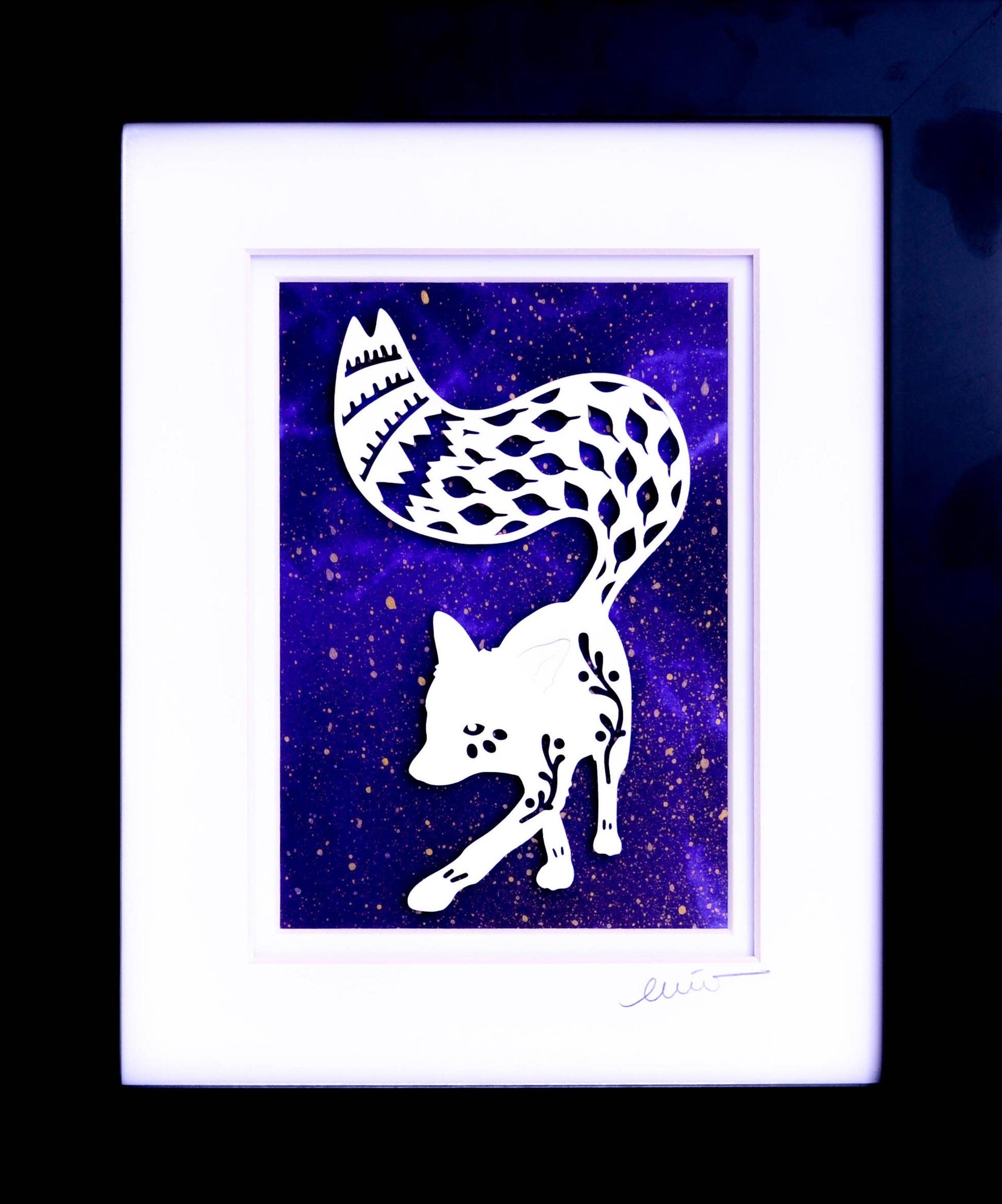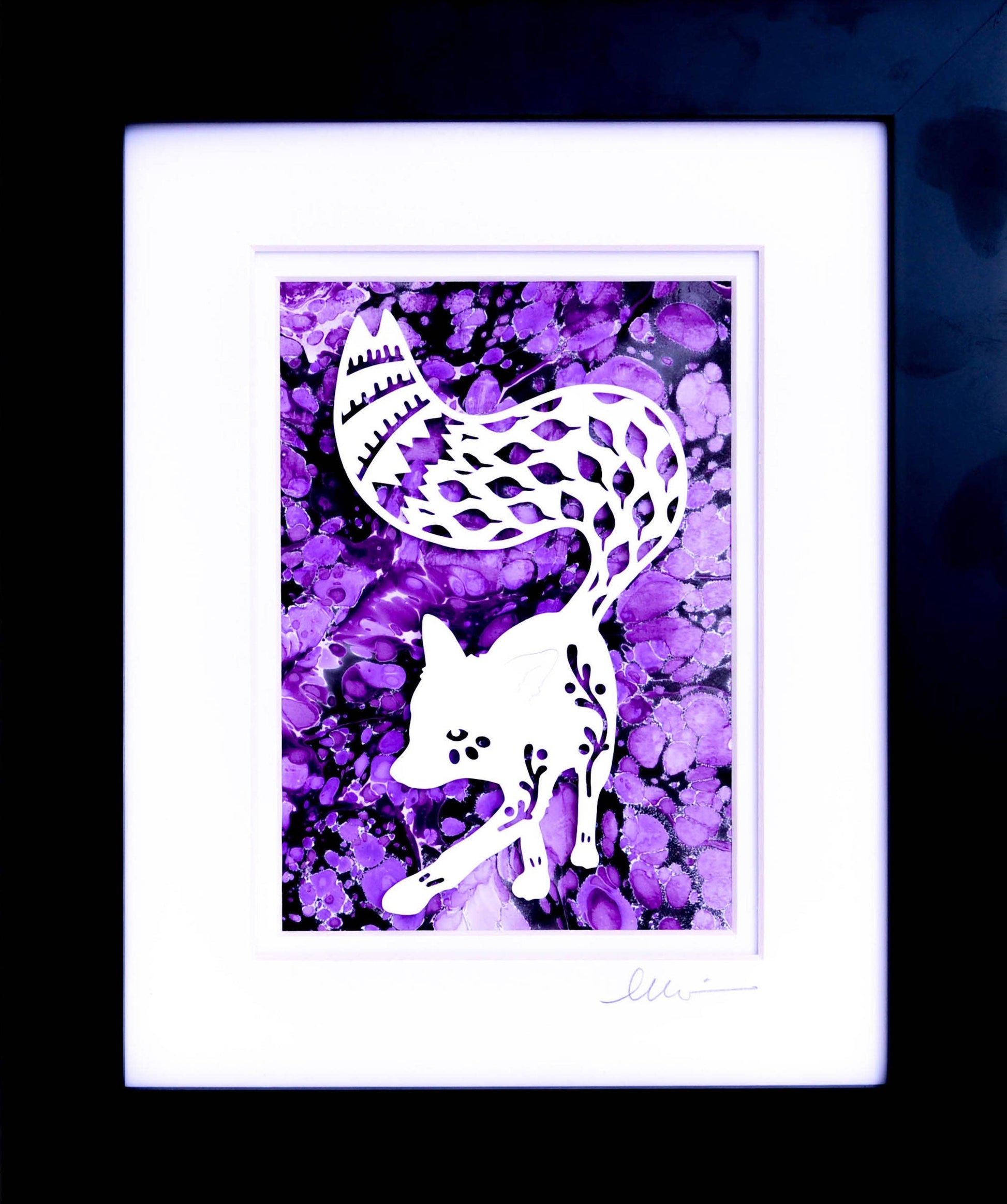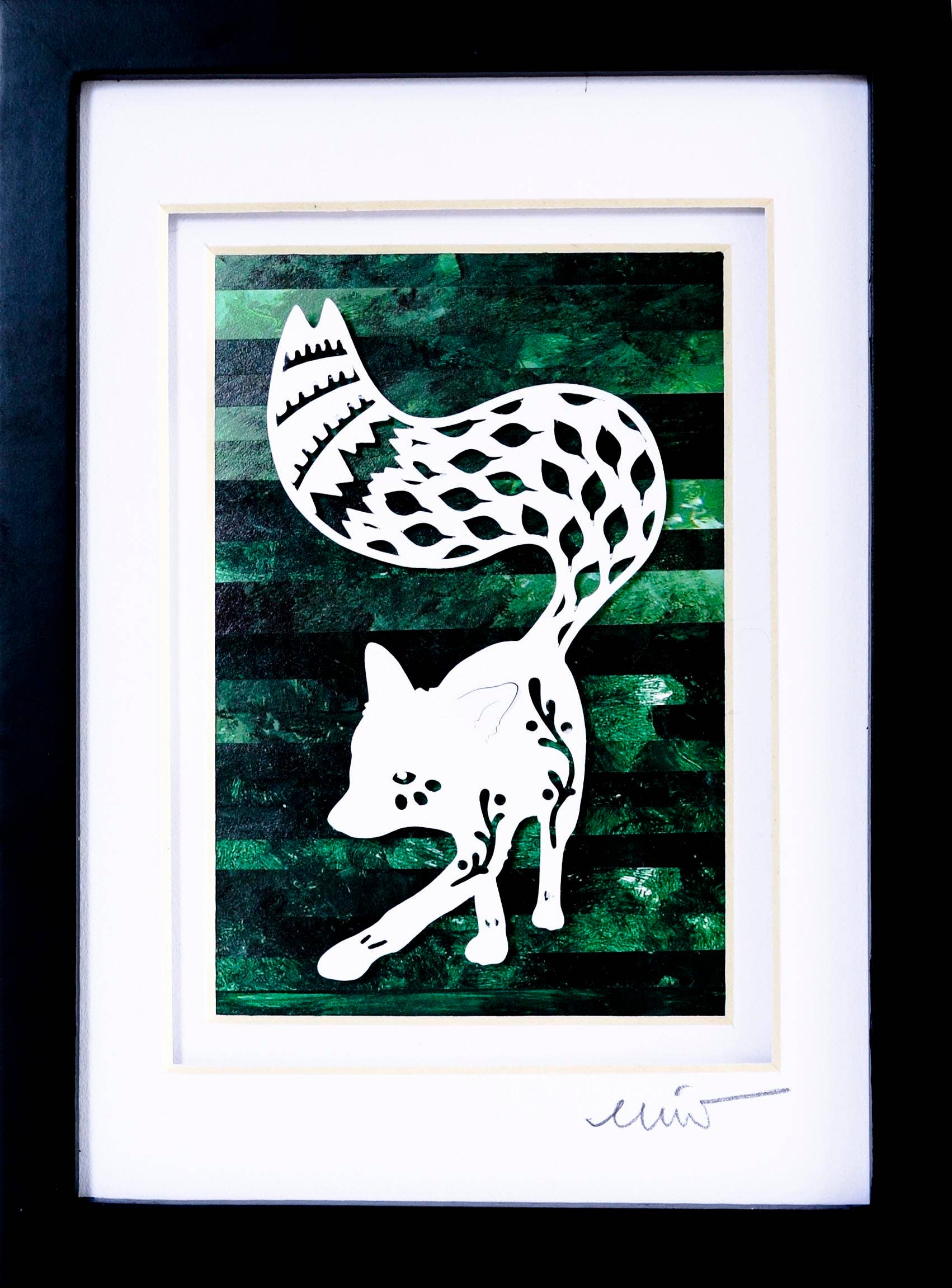 Each crisp, white papercut is set off by a “color me happy” one-of-a-kind background made from recycled paper or the artist’s own hand-marbled paper and acrylic paintings. Then signed, matted, and framed.