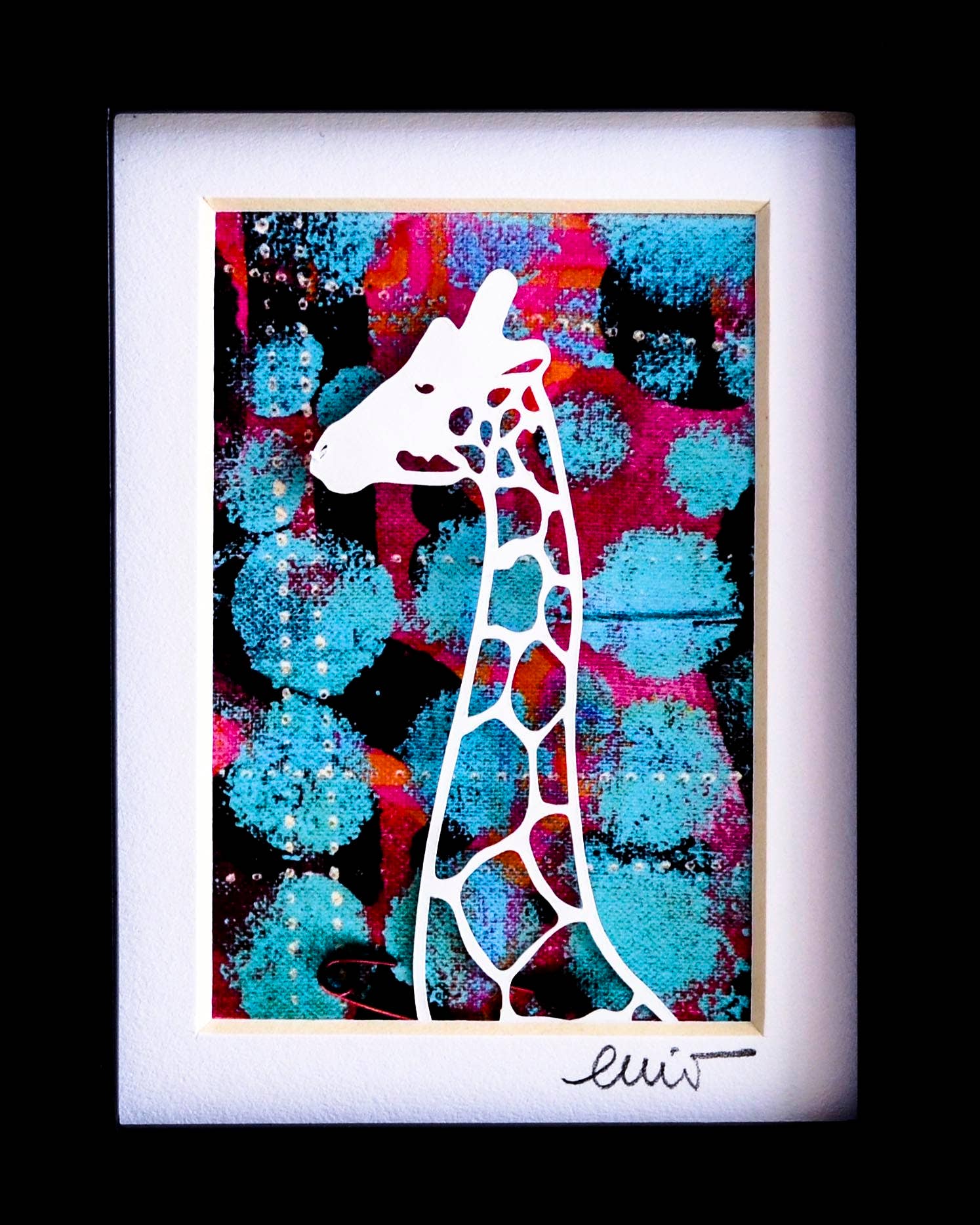 Each crisp, white papercut is set off by a “color me happy” one-of-a-kind background made from recycled paper or the artist’s own hand-marbled paper and acrylic paintings. Then signed, matted, and framed.
