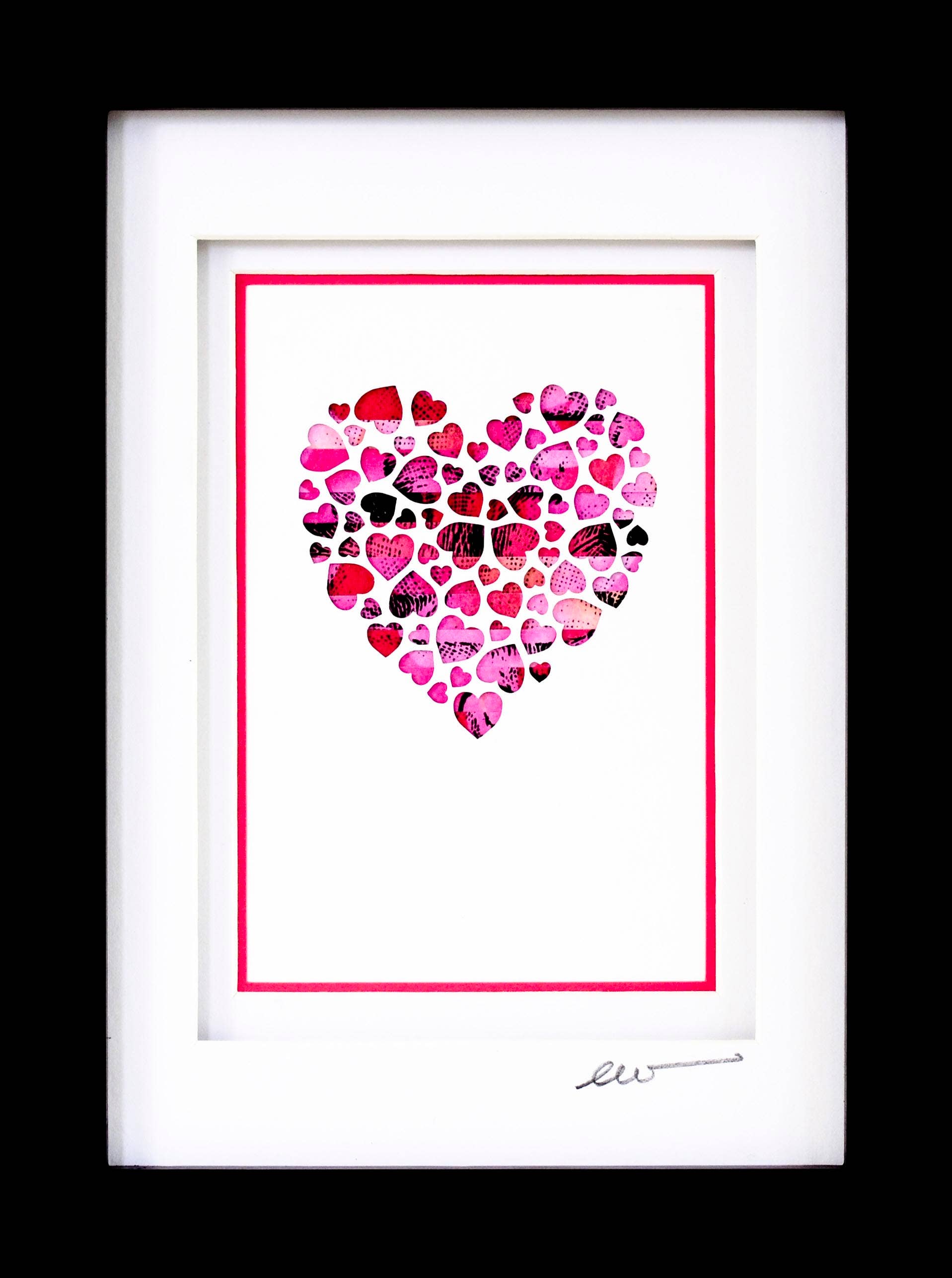 Each crisp, white papercut is set off by a “color me happy” one-of-a-kind background made from recycled paper or the artist’s own hand-marbled paper and acrylic paintings. Then signed, matted, and framed.