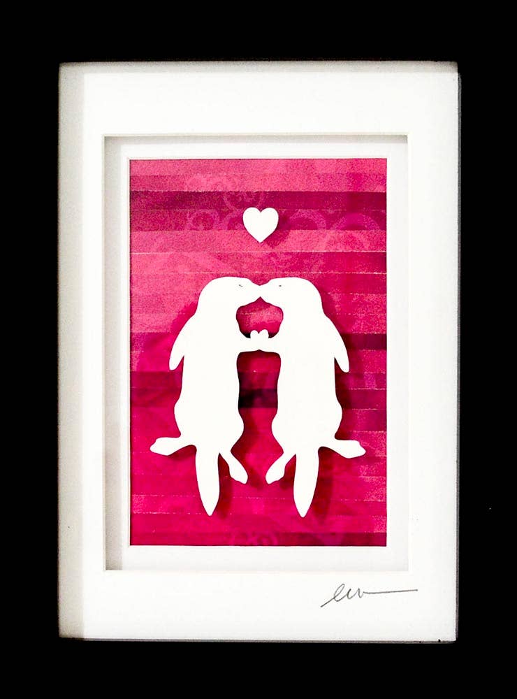 Each crisp, white papercut is set off by a “color me happy” one-of-a-kind background made from recycled paper or the artist’s own hand-marbled paper and acrylic paintings. Then signed, matted, and framed.