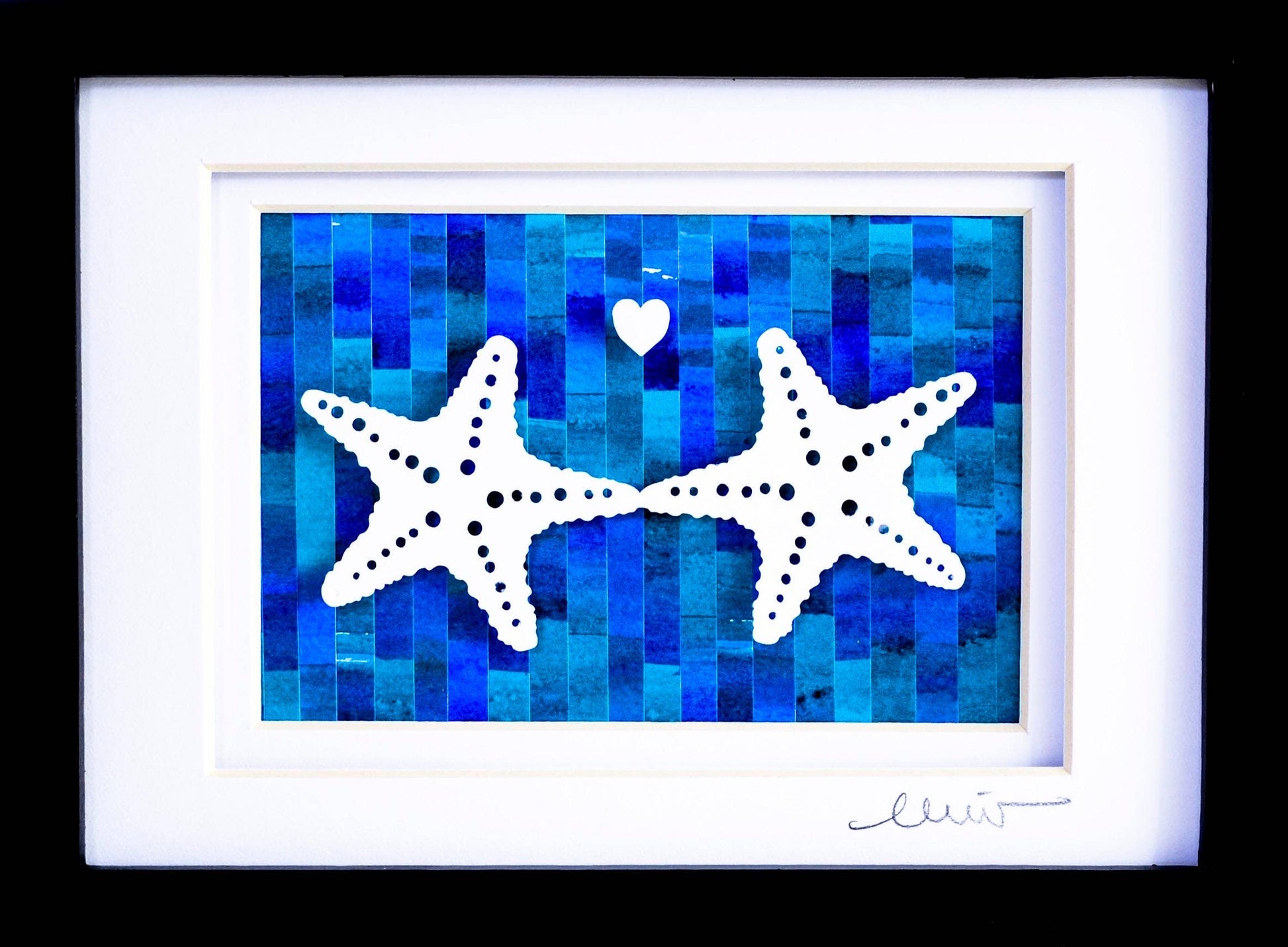 Each crisp, white papercut is set off by a “color me happy” one-of-a-kind background made from recycled paper or the artist’s own hand-marbled paper and acrylic paintings. Then signed, matted, and framed.
