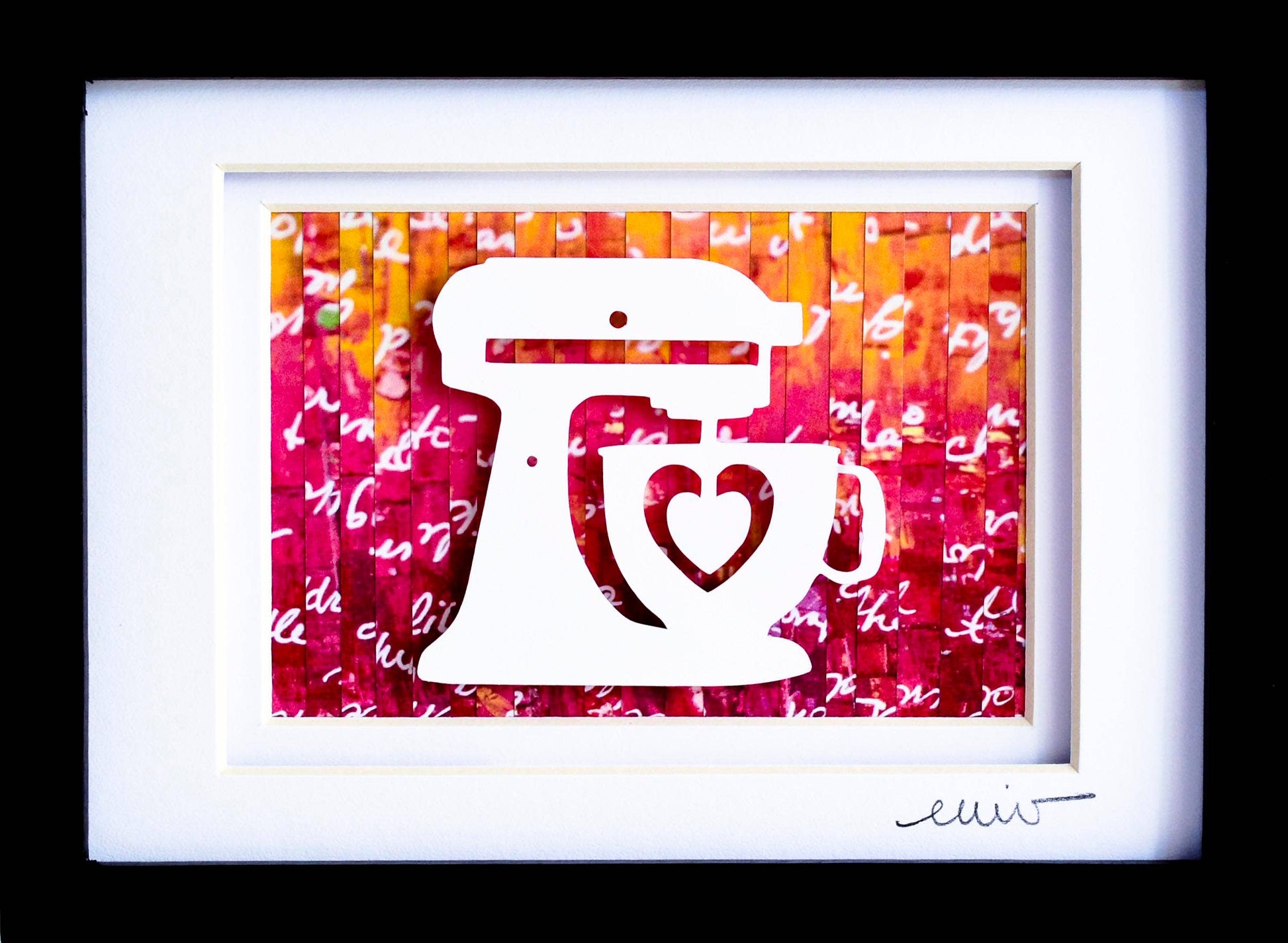Each crisp, white papercut is set off by a “color me happy” one-of-a-kind background made from recycled paper or the artist’s own hand-marbled paper and acrylic paintings. Then signed, matted, and framed.