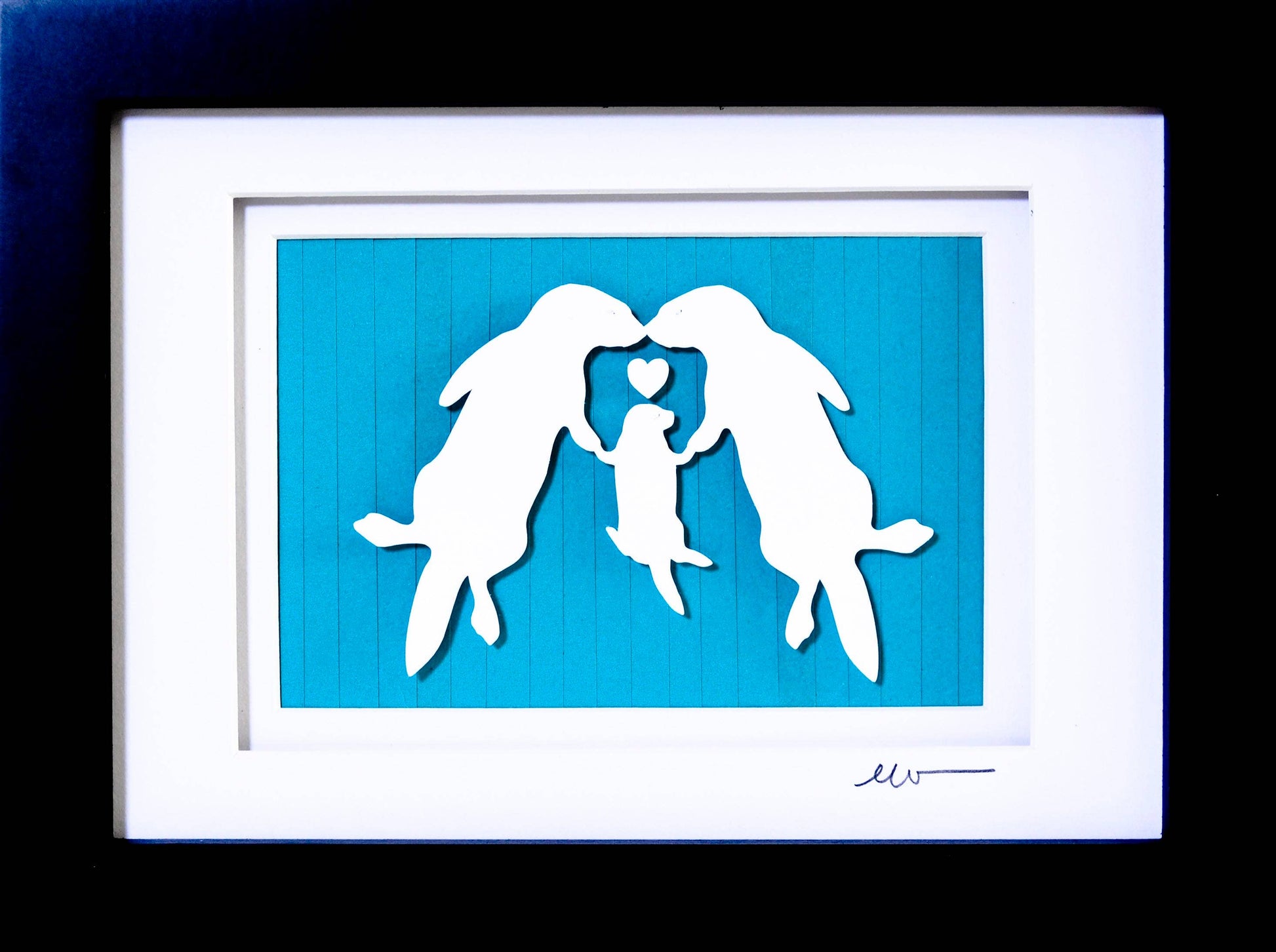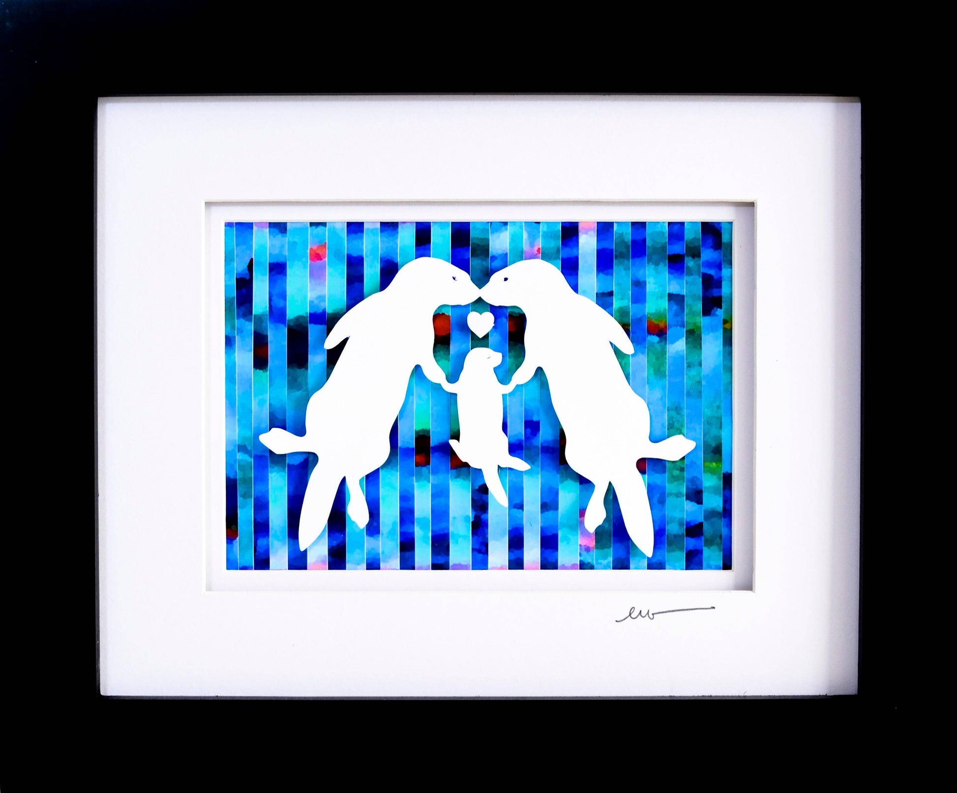 Each crisp, white papercut is set off by a “color me happy” one-of-a-kind background made from recycled paper or the artist’s own hand-marbled paper and acrylic paintings. Then signed, matted, and framed.