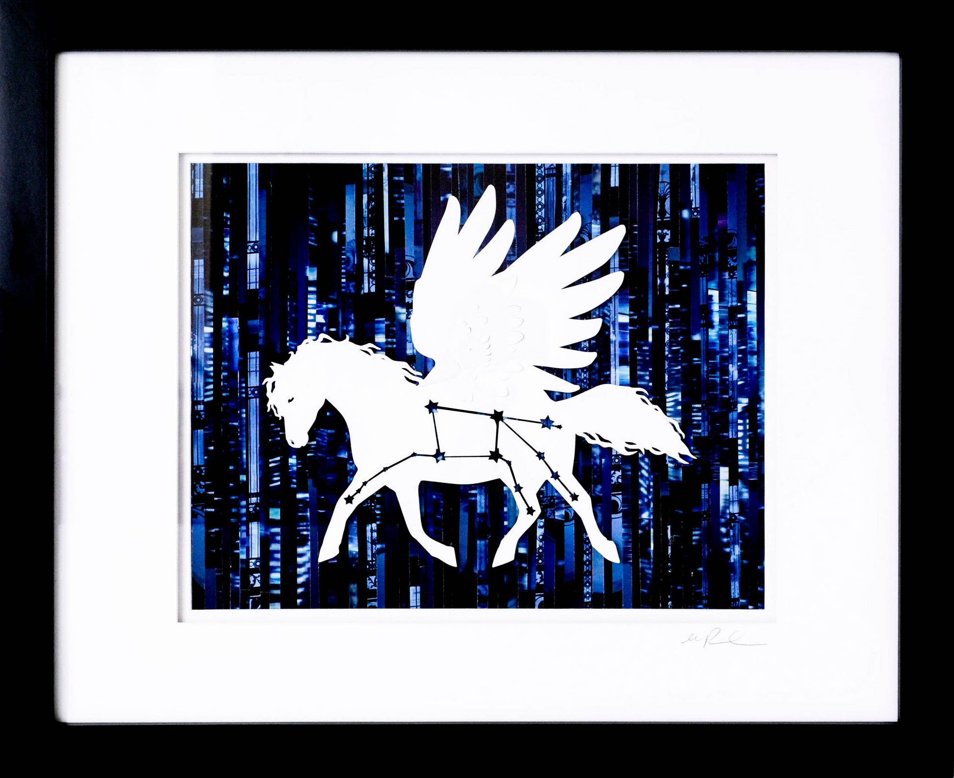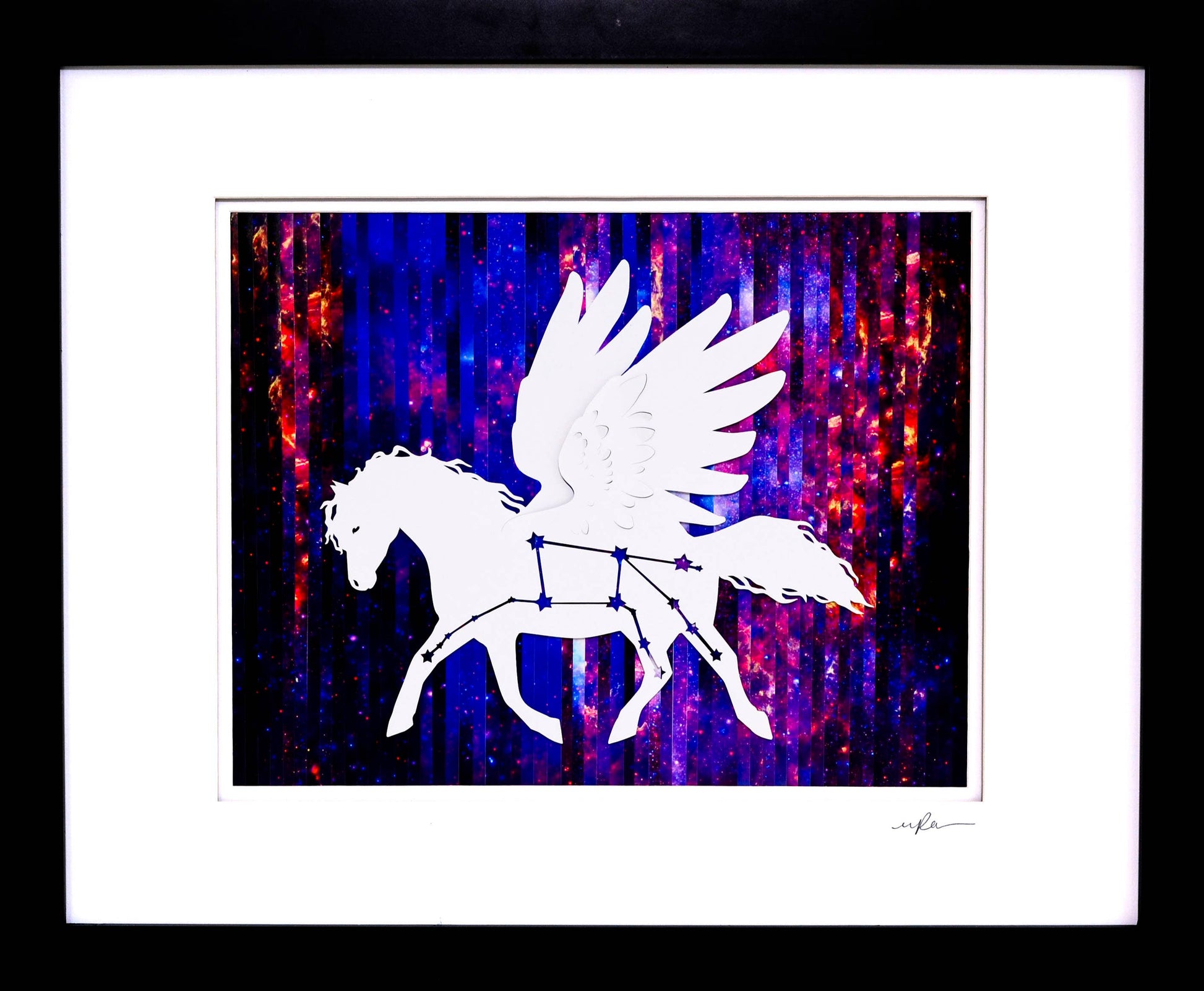 Each crisp, white papercut is set off by a “color me happy” one-of-a-kind background made from recycled paper or the artist’s own hand-marbled paper and acrylic paintings. Then signed, matted, and framed.