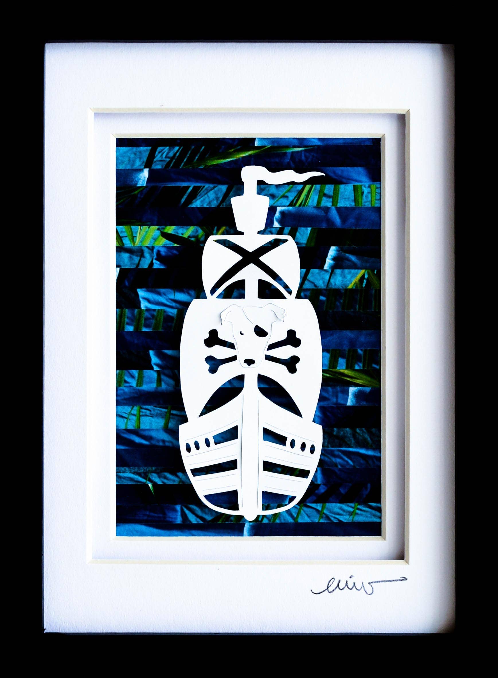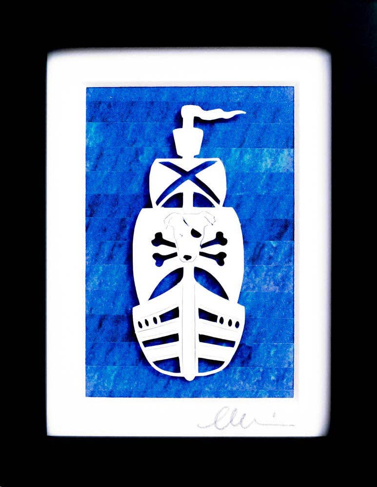 Each crisp, white papercut is set off by a “color me happy” one-of-a-kind background made from recycled paper or the artist’s own hand-marbled paper and acrylic paintings. Then signed, matted, and framed.
