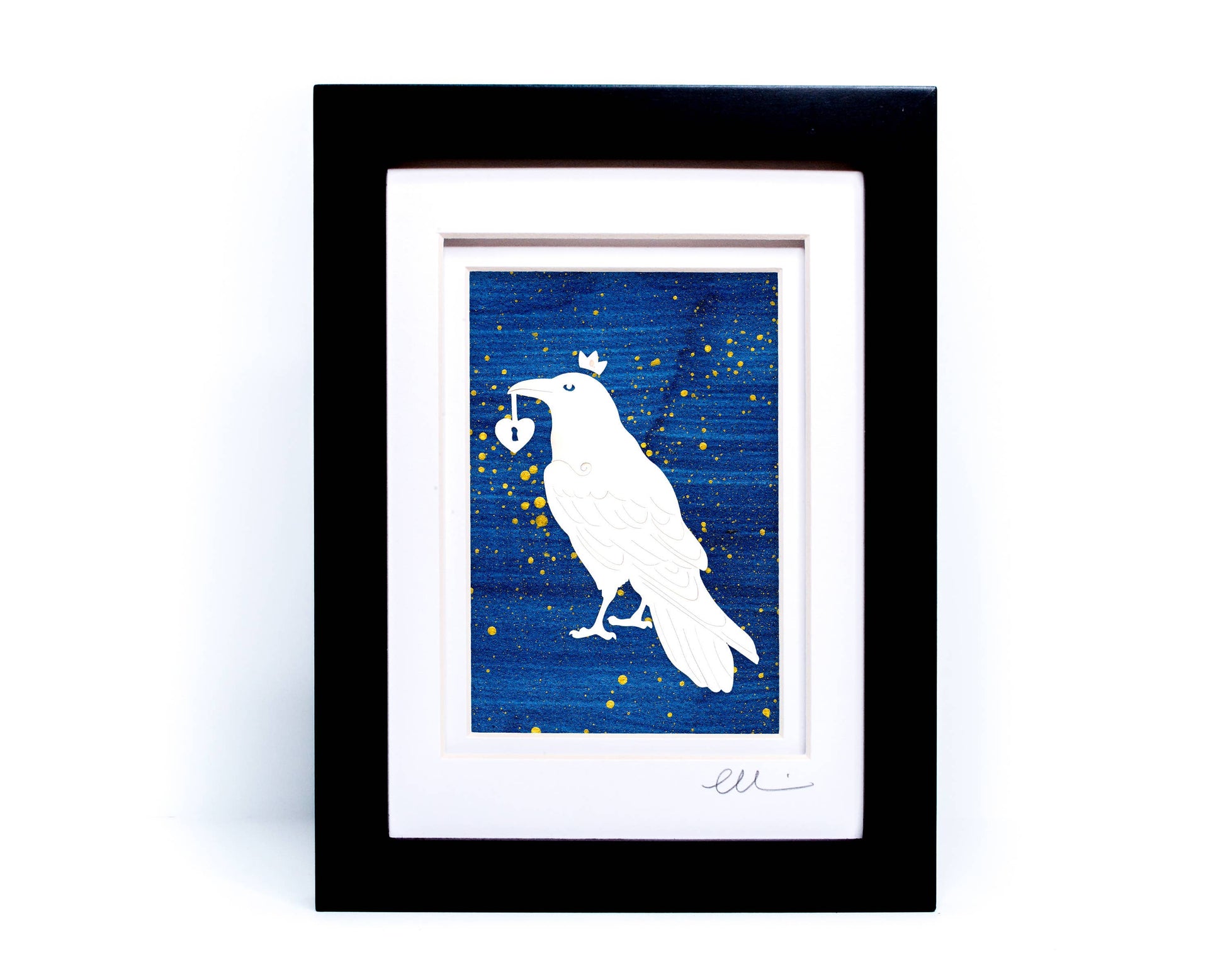 Each crisp, white papercut is set off by a “color me happy” one-of-a-kind background made from recycled paper or the artist’s own hand-marbled paper and acrylic paintings. Then signed, matted, and framed.