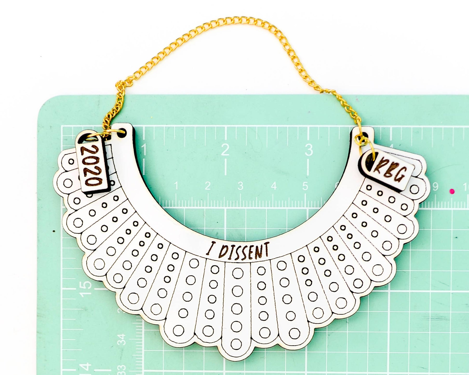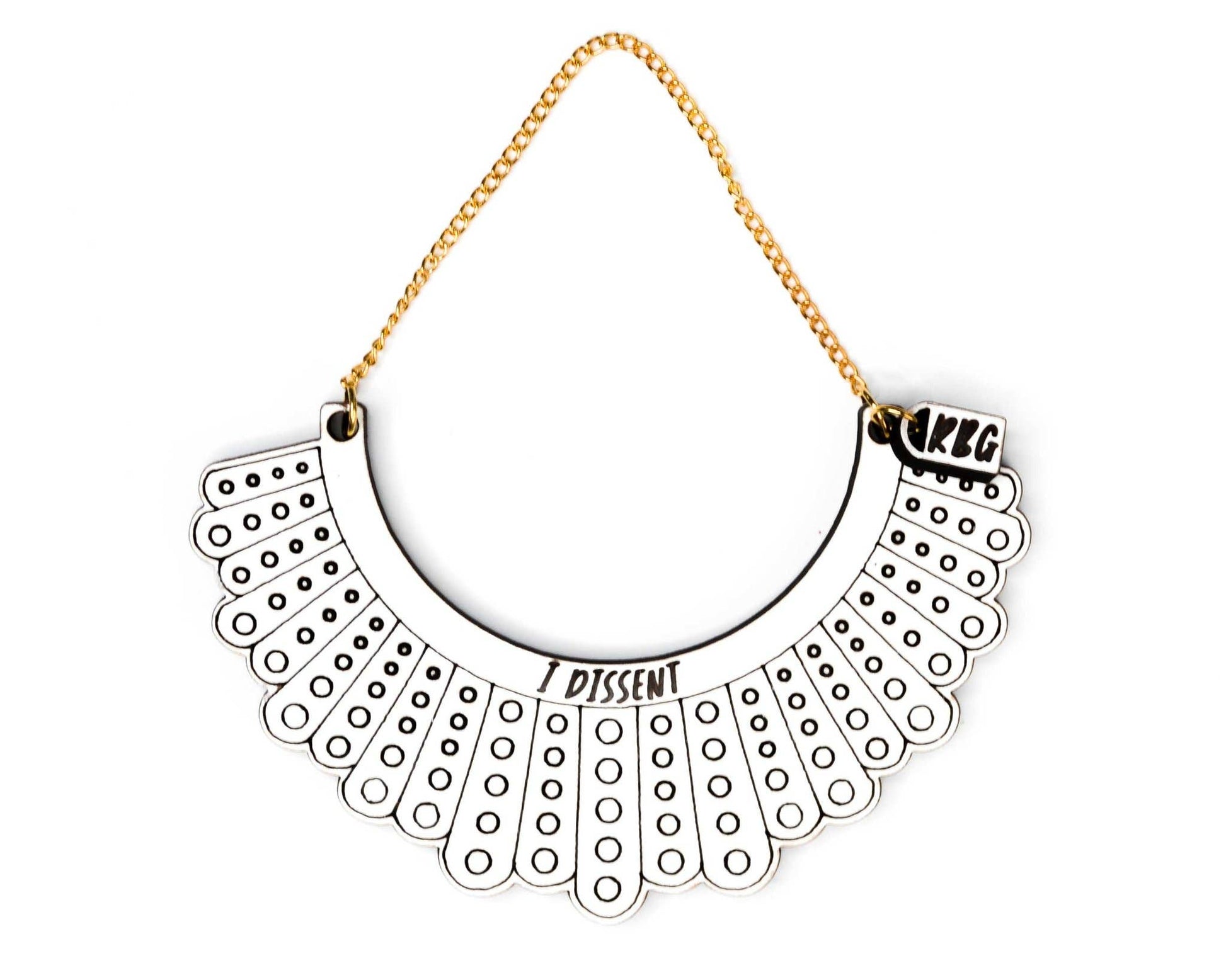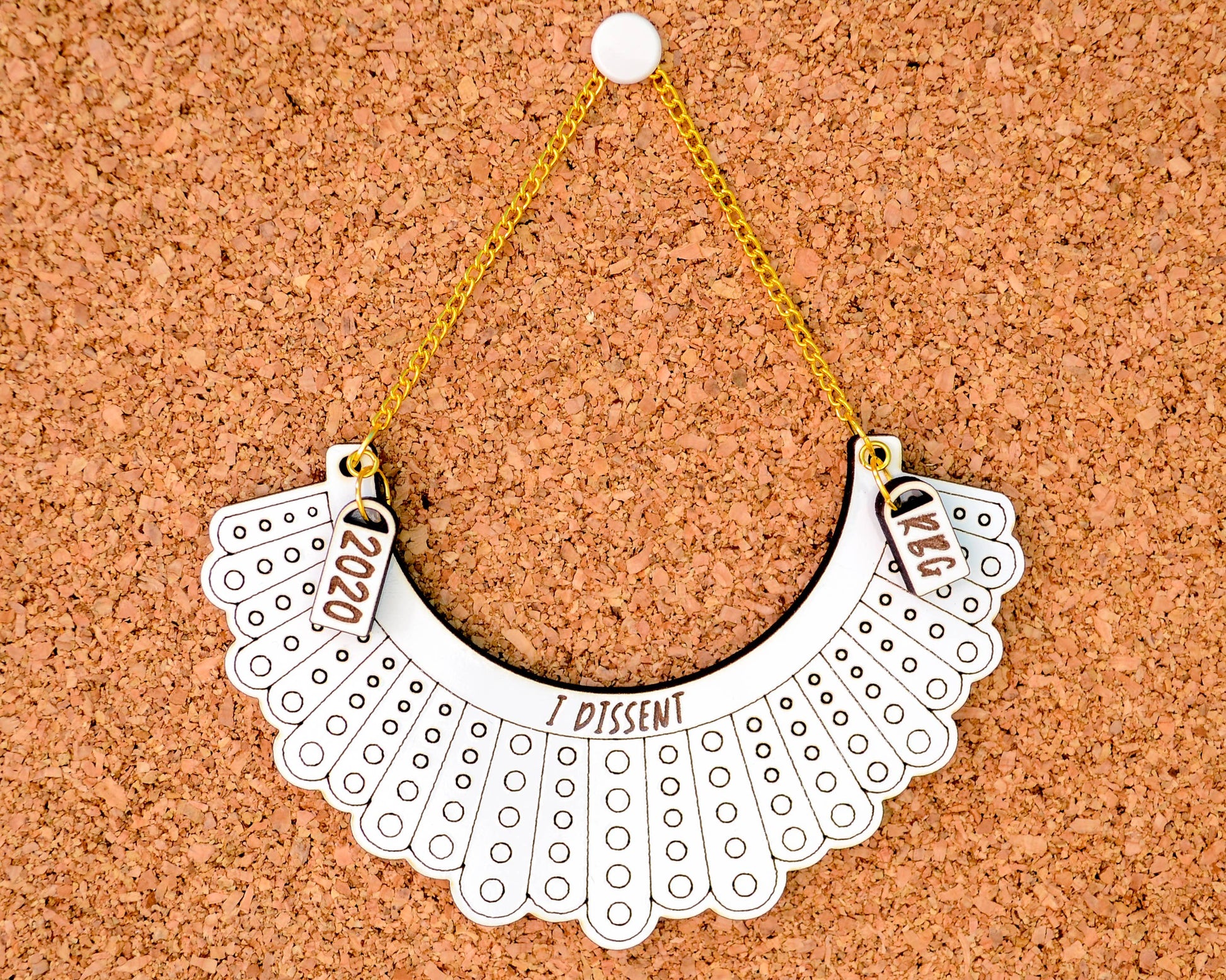 Wood ornament in the shape of RBGs infamous Dissent Collar.