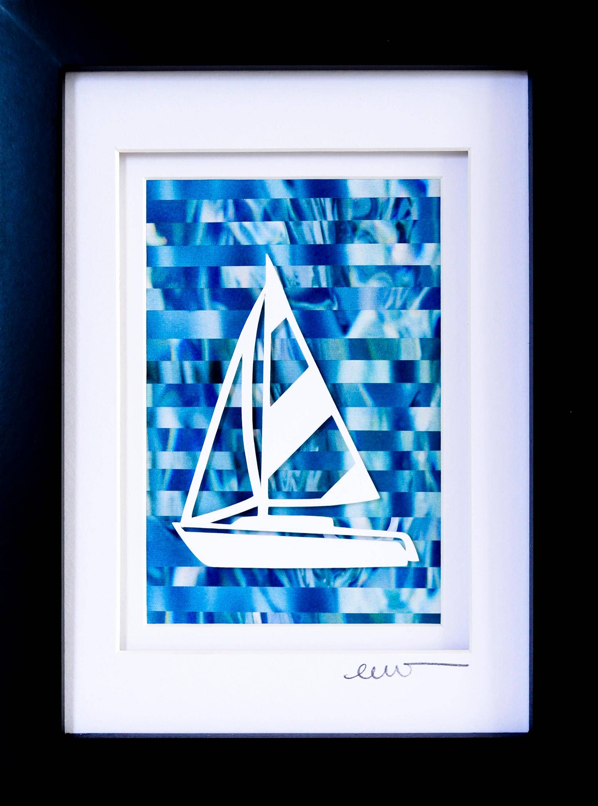 Each crisp, white papercut is set off by a “color me happy” one-of-a-kind background made from recycled paper or the artist’s own hand-marbled paper and acrylic paintings. Then signed, matted, and framed.