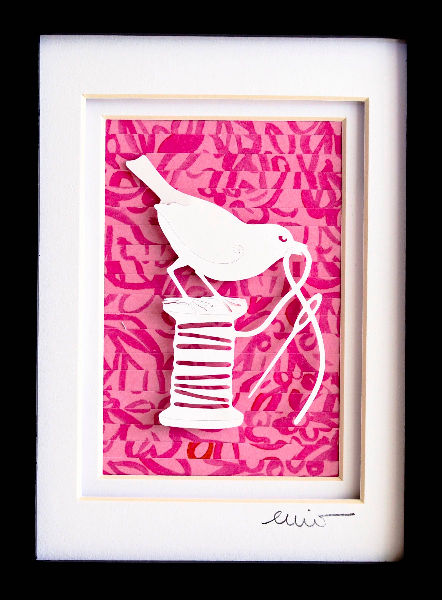 Each crisp, white papercut is set off by a “color me happy” one-of-a-kind background made from recycled paper or the artist’s own hand-marbled paper and acrylic paintings. Then signed, matted, and framed.