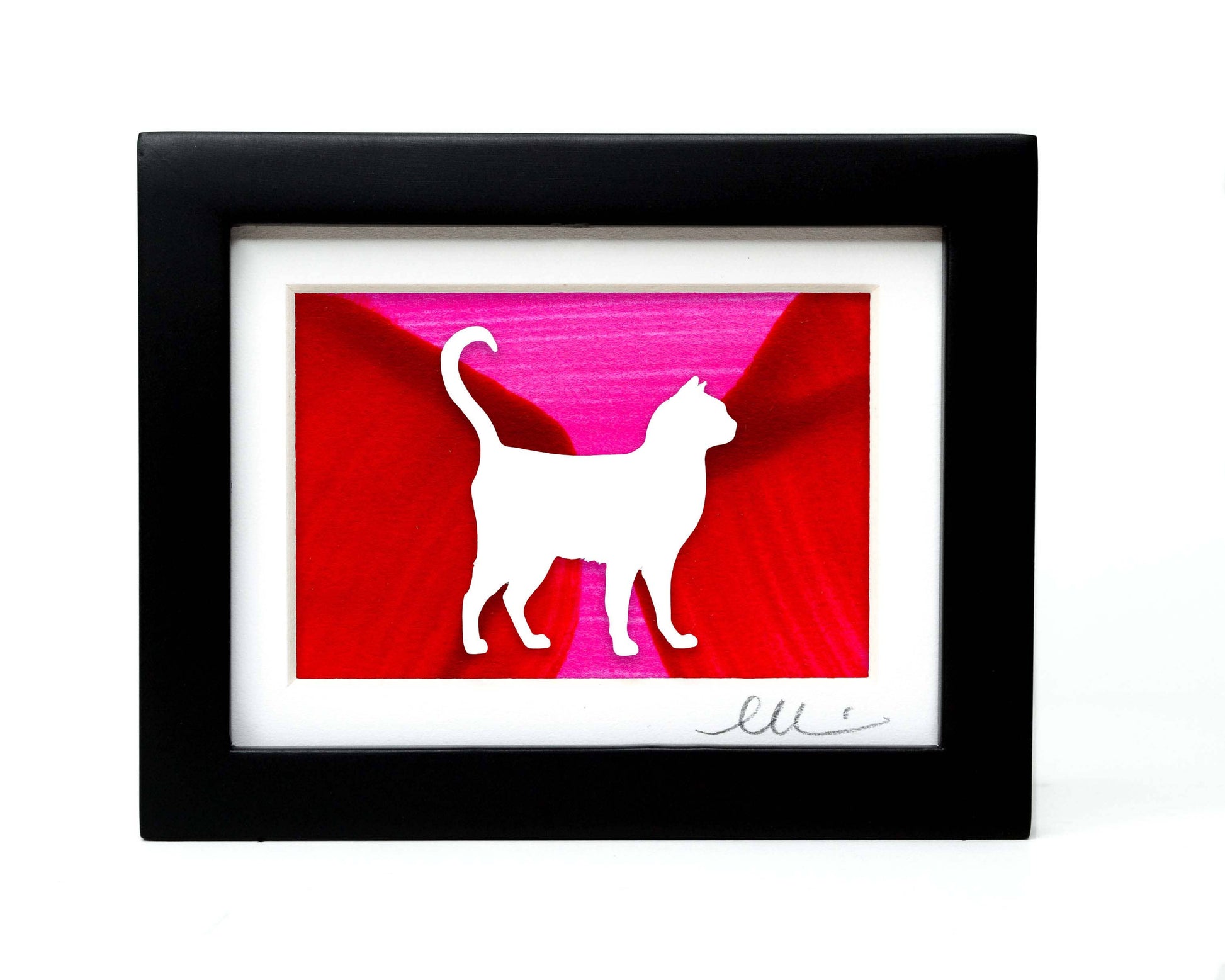 Each crisp, white papercut is set off by a “color me happy” one-of-a-kind background made from recycled paper or the artist’s own hand-marbled paper and acrylic paintings. Then signed, matted, and framed.