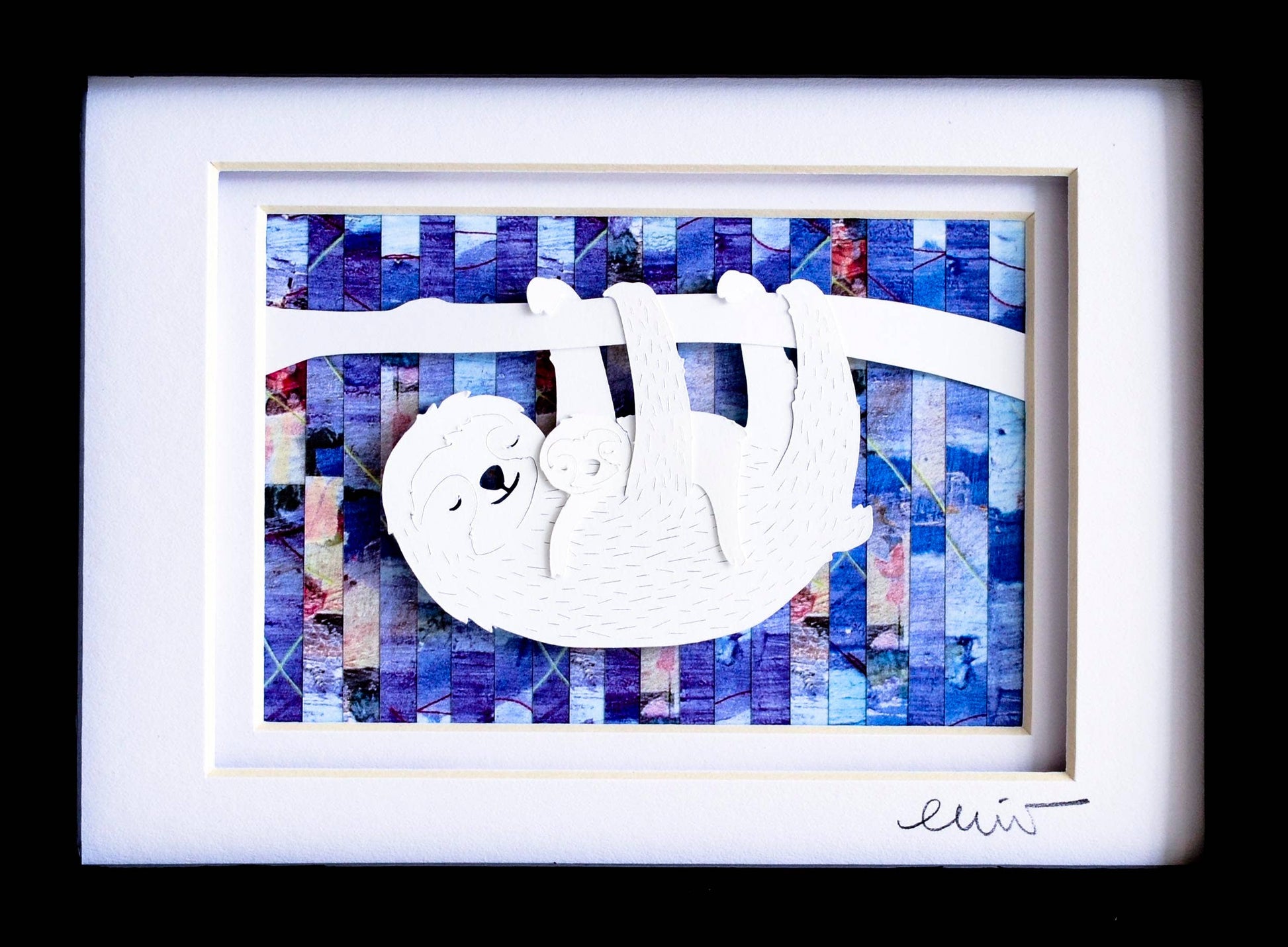 Each crisp, white papercut is set off by a “color me happy” one-of-a-kind background made from recycled paper or the artist’s own hand-marbled paper and acrylic paintings. Then signed, matted, and framed.