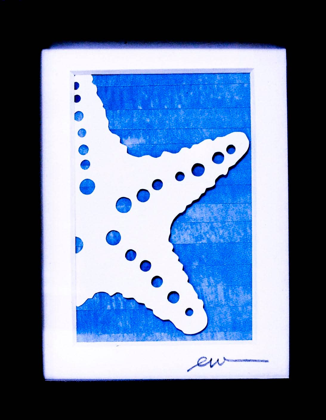 Each crisp, white papercut is set off by a “color me happy” one-of-a-kind background made from recycled paper or the artist’s own hand-marbled paper and acrylic paintings. Then signed, matted, and framed.