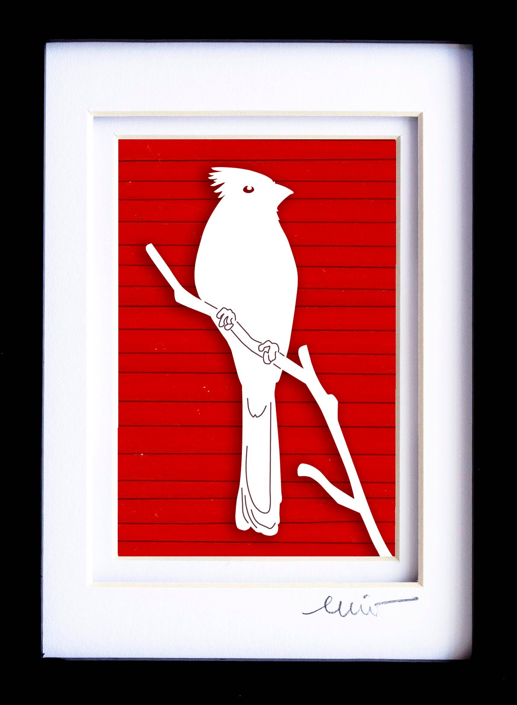 Each crisp, white papercut is set off by a “color me happy” one-of-a-kind background made from recycled paper or the artist’s own hand-marbled paper and acrylic paintings. Then signed, matted, and framed.