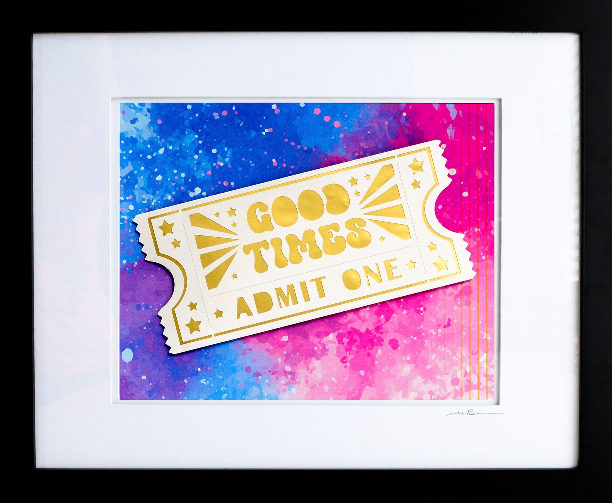 Each crisp white papercut features a unique “color me happy” background crafted from recycled paper or the artist’s hand-marbled paper and acrylic paintings.