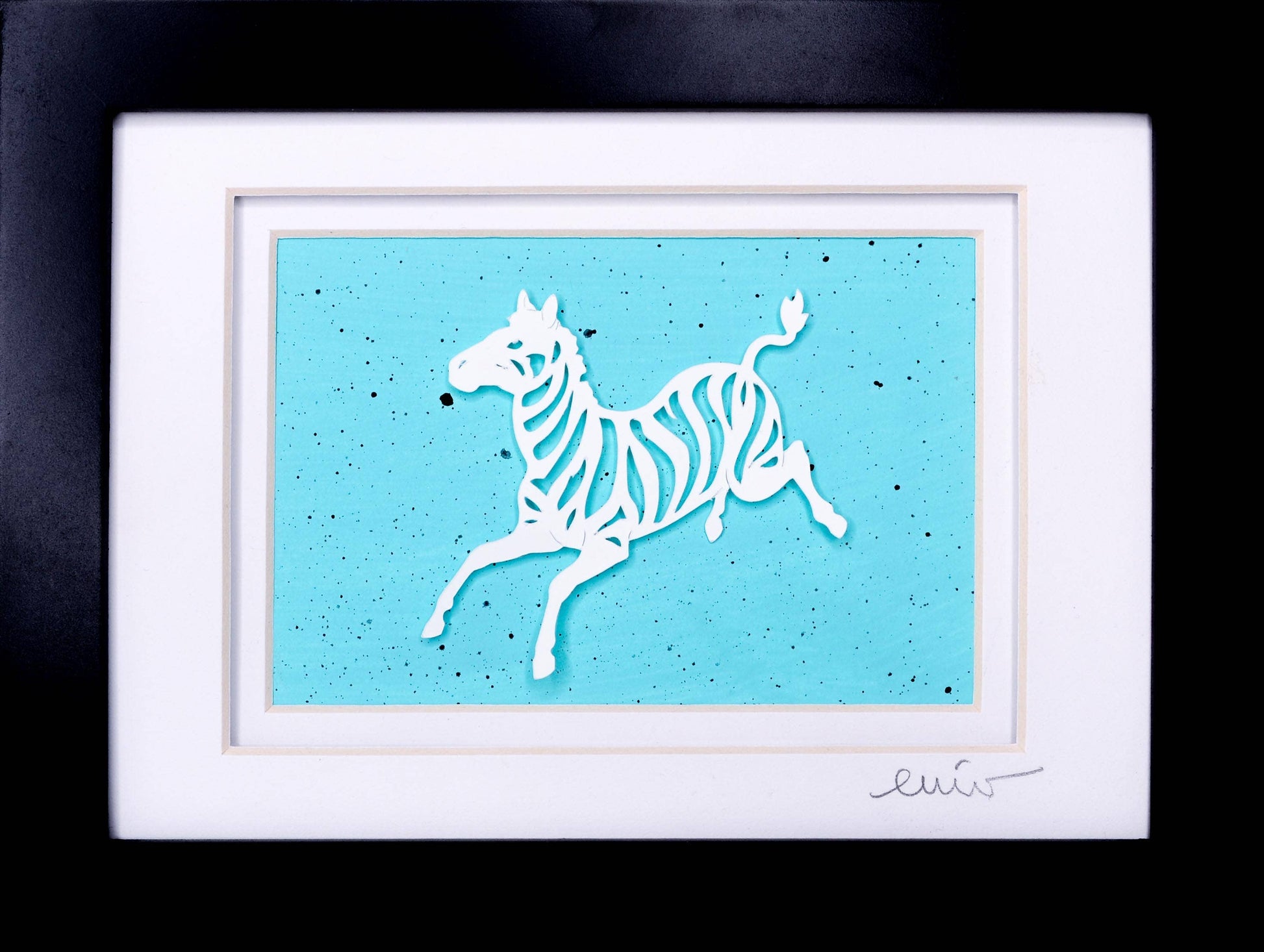 Each crisp, white papercut is set off by a “color me happy” one-of-a-kind background made from recycled paper or the artist’s own hand-marbled paper and acrylic paintings. Then signed, matted, and framed.